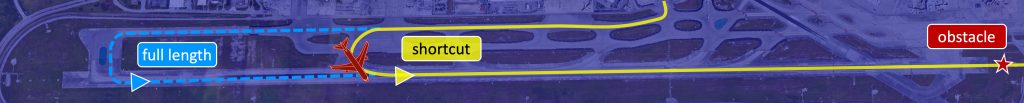 A heavily loaded long-haul aircraft is taxiing to the runway. Although the crew has calculated the take-off using the full length of the runway, the captain spontaneously decides to take a shortcut, effectively giving up one third of the available runway distance
